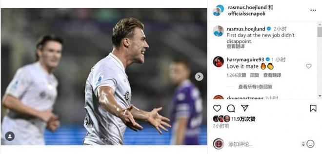 霍伊伦社媒晒出庆祝进球的照片,配文:“新工作的第一天没有让人失望。”