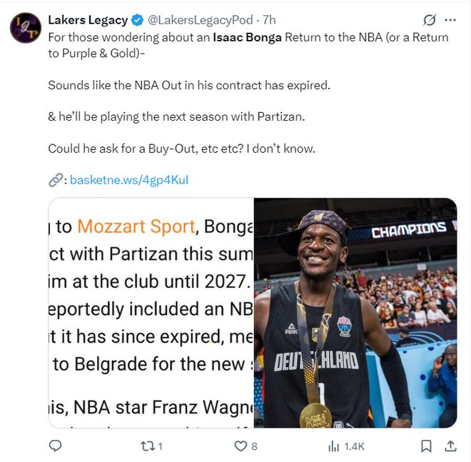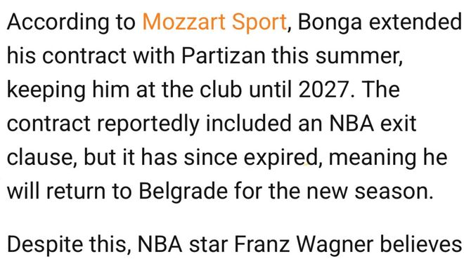 邦加上赛季效力塞尔维亚联赛的贝尔格莱德游击队,他今夏已经跟游击队续约到2027年,而且他合同中的重返NBA条款已经失效(过了时效),所以他下赛季不得不重返塞尔维亚联赛。