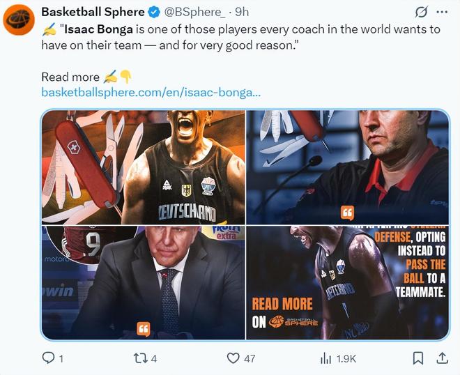 德国男篮主教练也这样评价邦加:他是每一位教练都渴望得到的球员,他的防守专注度令人青睐有加,这些大家都是有目共睹的。