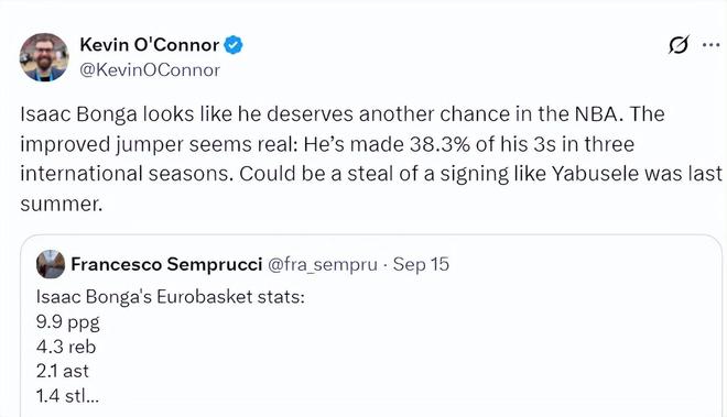 就连NBA记者凯文-奥康纳都说邦加看起来值得在获得一次机会,他的跳投有很大进步,过去三个赛季,他的三分命中率达到38.3%。(他是2018年次轮39顺位,进入联盟时效力洛杉矶湖人队)