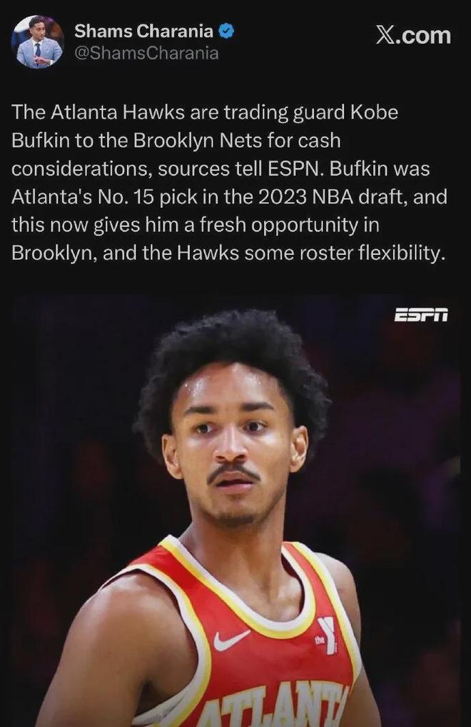 爆料王Shams:老鹰将科比-巴夫金交易至篮网,换回部分现金。名记Scotto对此表示,篮网支付的现金为11万美元......