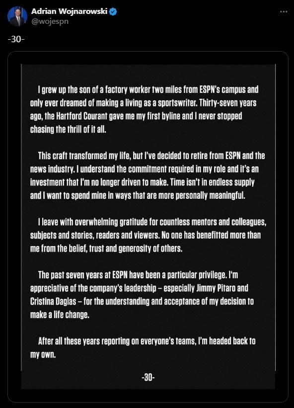 “这份工作改变了我的生活,但我决定从ESPN和新闻行业退休。我理解我的角色所要承担的责任。这是一项我不再被迫做出的投资。时间是无尽的,我想以更有个人意义的方式度过我的时间。