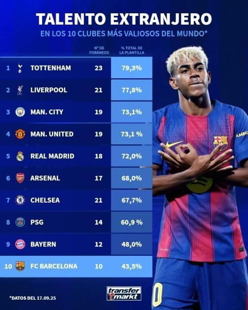直播吧9月18日宣 德国转会市场统计了身价排名前十俱乐部的外籍球员占比,并列出榜单,在身价前十俱乐部之中,热刺外援占比79.3%最高,巴萨43.5%最低。
