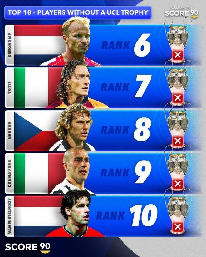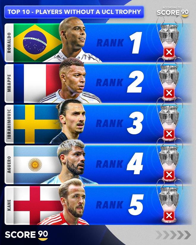 雷速体育9月19日宣 近日,媒体Score90评选出了“没有欧冠十大巨星”。表示尽管他们在世界足坛都有着辉煌成就,但至今仍未能捧起欧冠奖杯,成为生涯的一大遗憾。其中,巴西传奇罗纳尔多位居榜首。