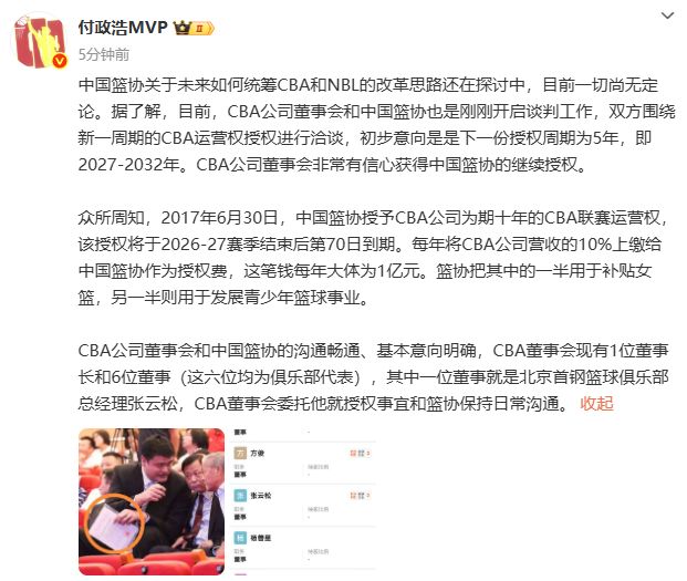 雷速体育9月23日讯 今日,国内体育媒体人@付政浩MVP发文,谈到了CBA联赛未来运营权的归属。