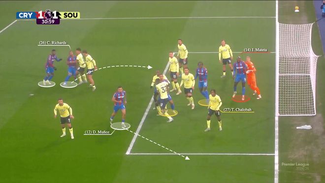 水晶宫的站位相对传统:禁区外有三名球员负责防反击(蒂里克-米切尔未入镜),跑位球员包括理查兹、莱尔马和穆尼奥斯(白色),特雷沃-查洛巴和拉克鲁瓦是主要目标点(黄色),而马特塔则站在门将身前(红色)。