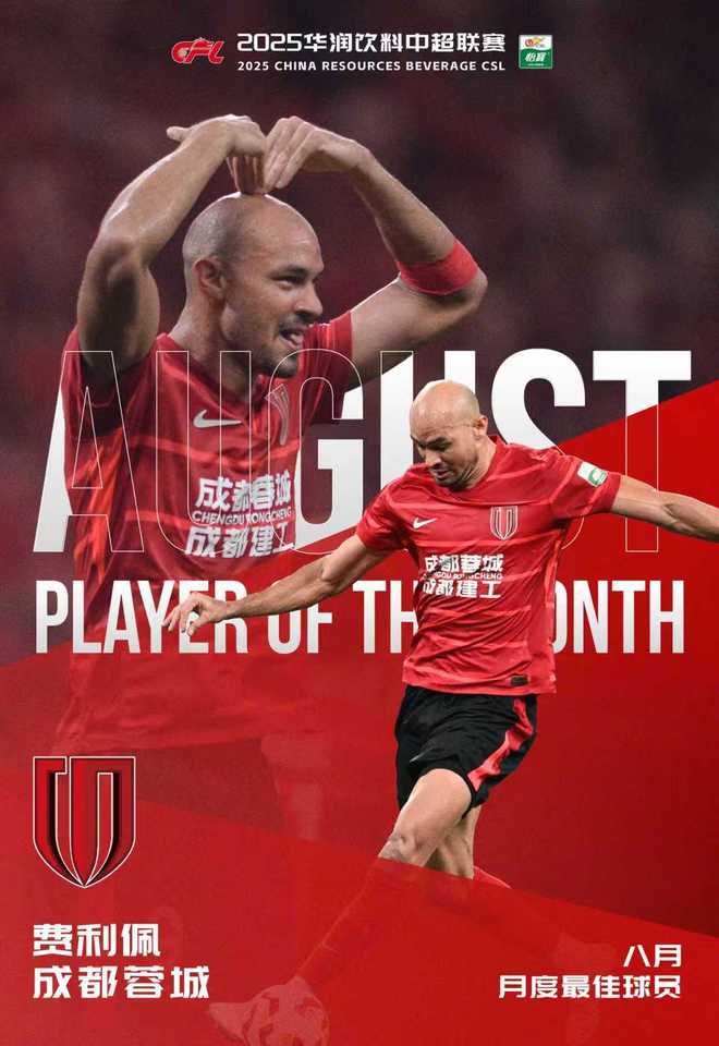 雷速体育9月25日宣 中超联赛官方今日公布了8月份最佳球员,成都蓉城外援费利佩当选。