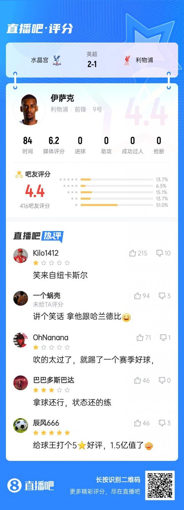 昨晚英超第6轮,利物浦1-2不敌水晶宫吃到赛季首败。本场比赛伊萨克首发出场,但表现平平,射正、过人等多项数据挂零,遭到球迷吐槽,仅得到4.4的低分。