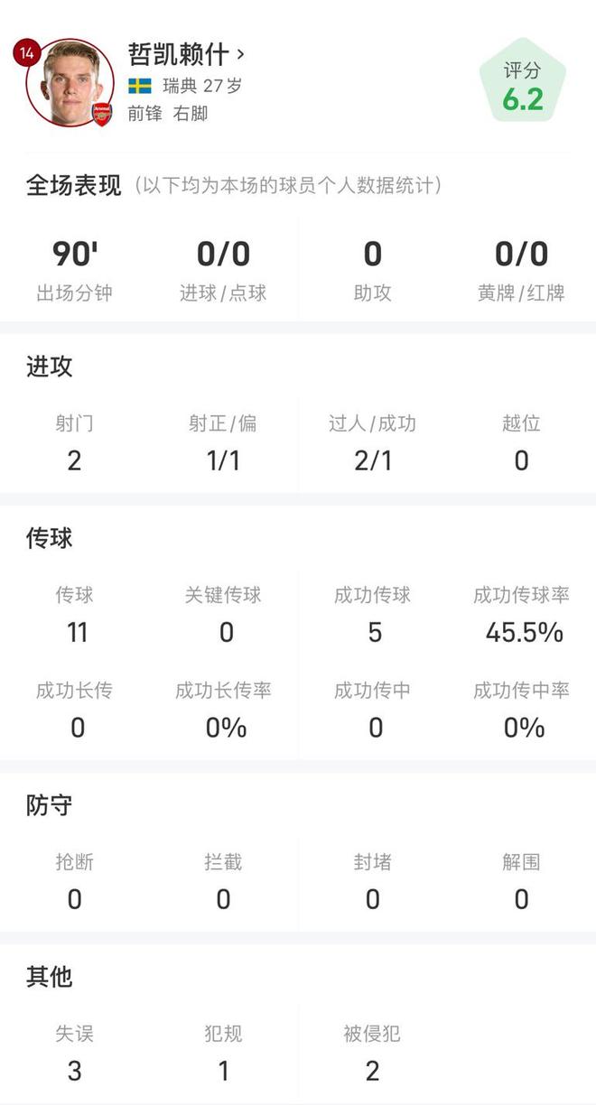 雷速体育10月5日宣 英超第7轮,阿森纳主场2比0击败西汉姆联。阿森纳前锋哲凯赖什首发踢满全场。