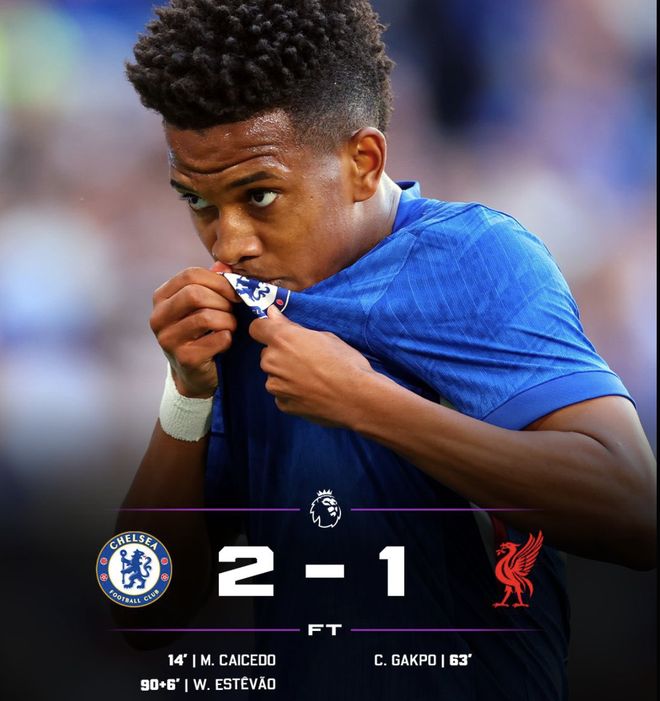 雷速体育10月5日宣 刚刚结束的英超第七轮的焦点战中,切尔西2-1战胜利物浦。比赛上半场凯塞多远射帮助蓝军首开纪录。下半场加克波接伊萨克助攻帮助利物浦扳平。比赛补时阶段,切尔西替补上场的埃斯特旺绝杀利物浦,送利物浦三连败。