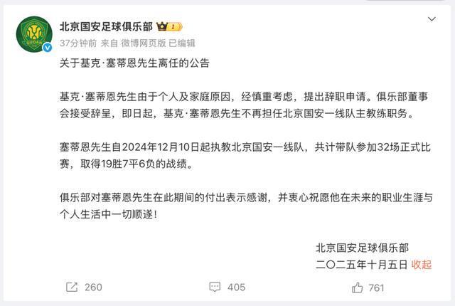 10月5日晚,@北京国安足球俱乐部 宣布基克·塞蒂恩辞职,不再担任北京国安一线队主教练职务。