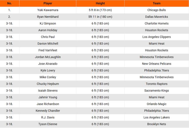 尽管NBA历史上有很多身高不到6英尺的NBA球员,但目前在NBA中只有两名这样的球员,分别是公牛队的河村勇辉(5英尺8英寸,1米73)和独行侠的内姆布哈德(5英尺11英寸,1米80,步行者球员内姆布哈德的弟弟)。