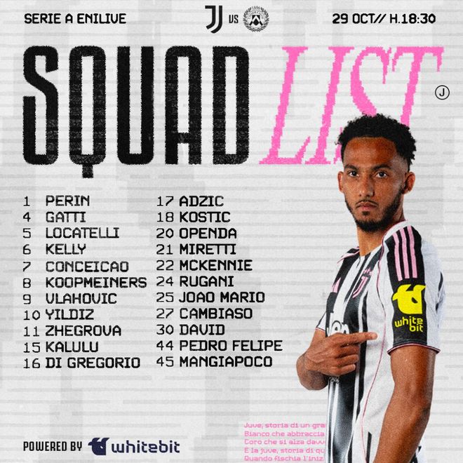 雷速体育10月29日宣 北京时间10月30日凌晨1:30,尤文图斯将在意甲主场迎战乌迪内斯,赛前尤文官方公布了球队本场的大名单。其中队内的法国中场凯夫伦·图拉姆,缺席了本场比赛的大名单。