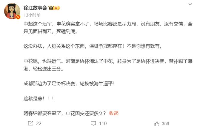 而对于上海申花、上海海港在最后一轮争冠,也是引来不少媒体人热议,其中,记者徐江发文表示,中超这个冠军,申花确实拿不了,场场比赛都是尽力局,没有朋友,没有交情,全是见面拼刺刀,死磕到底。