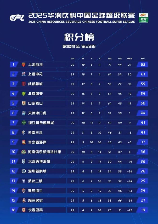 争冠赛道上,上海海港与上海申花的“同城德比”延伸至赛季终章。积分榜上,海港以63分领跑,申花61分紧随其后,两队本赛季交锋海港1胜1平占据优势,这让海港手握“打平即夺冠”的主动权。末轮海港客场挑战已保级的大连英博,只需守住不败就能实现三连冠伟业;而申花必须在客场击败天津津门虎,同时寄望大连英博在主场阻击海港,才能完成逆风翻盘。