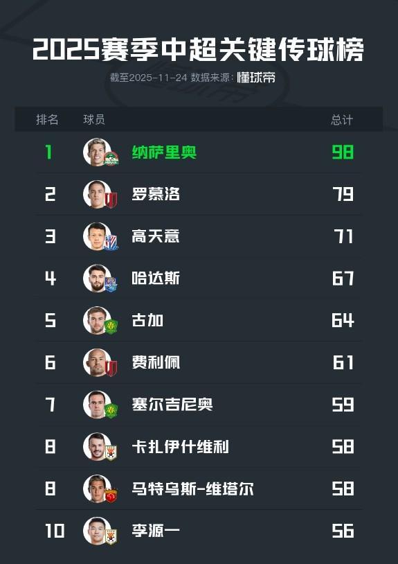 11月22日,2025赛季中超联赛落下战幕。根据懂球帝统计的2025赛季中超球员关键传球榜单:河南队外援纳萨里奥以98次居首;本土球员里高天意最多,71次。