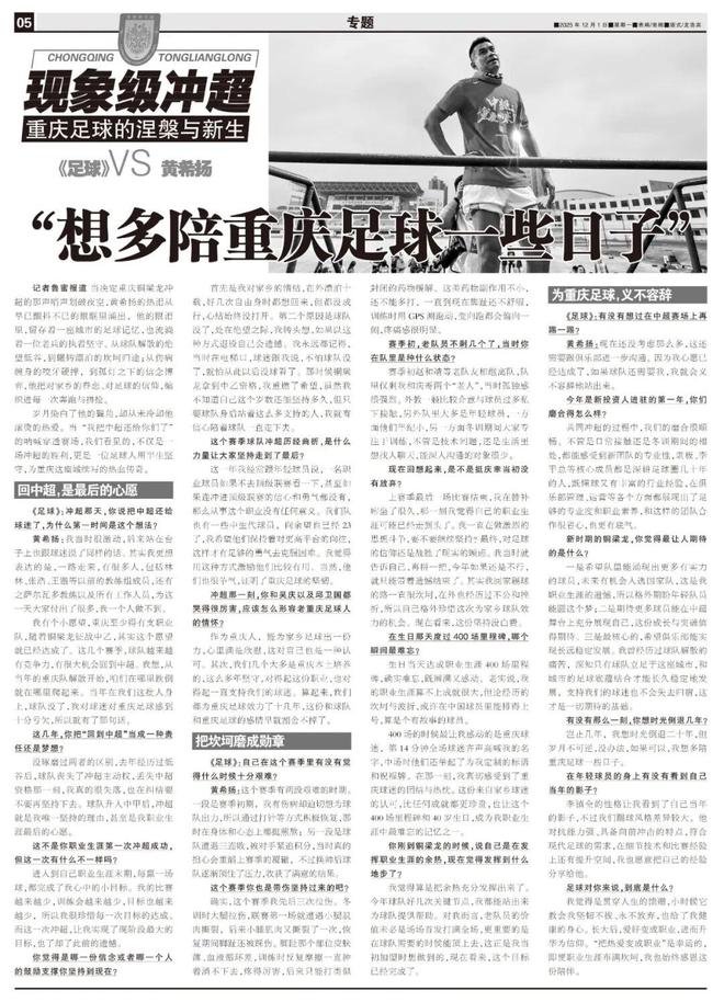 记者鲁蜜报道当决定重庆铜梁龙冲超的那声哨声划破夜空,黄希扬的热泪从早已颤抖不已的眼眶里涌出,他的眼泪里,留存着一座城市的足球记忆,也流淌着一位老兵的执着坚守。从球队解散的绝望低谷,到辗转漂泊的坎坷归途;从伤病缠身的咬牙硬撑,到孤灯之下的信念博弈,他把对家乡的眷恋、对足球的信仰,编织进每一次奔跑与拼抢。