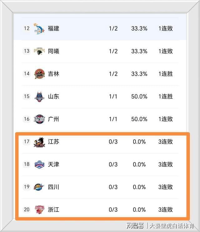 江苏队、天津队、四川队以及浙江队,4支球队都是开局3连败,至今未尝一胜,尤其是浙江男篮,作为上赛季的季后赛球队,新赛季开赛以来排名垫底,确实令人大跌眼镜。